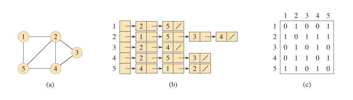 Adjacency refers to the concept of neighborhood in graph theory. In an adjacency- list, we represent a graph by listing each vertex along with its neighboring (connected) vertices. Looking at the image above (a), we see that vertex 1 has vertices 2 and 5 as its neighbors. Similarly, vertex 2 has vertices 1, 3, 4, and 5 as its neighbors, and so on. This representation is illustrated in image (b).