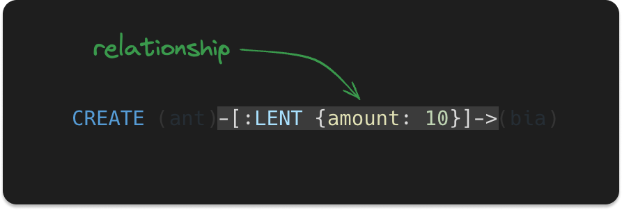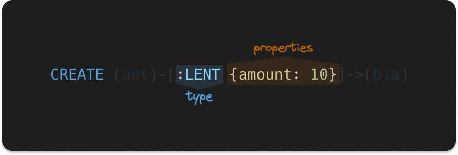 Relationships in Cypher resemble an arrow with a rectangle in the middle, where some metadata can be added: type and properties.