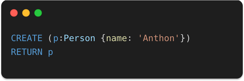 This part defines the properties of the node, in this case, assigning the name "Anthon" to the node. Properties store additional information about a node, like attributes in a relational database, such as a name, age, or email.