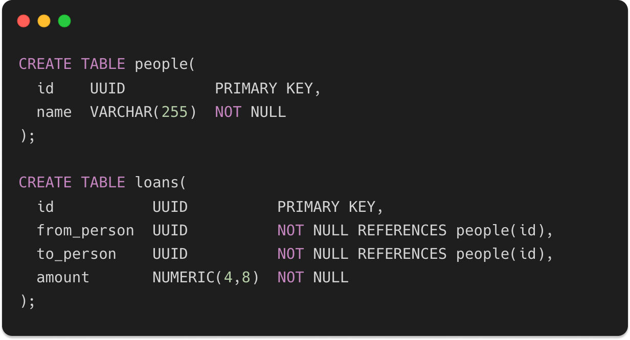 If we were to compare with SQL, we would need two tables to achieve the same result: one to store people and another for the loans. Something along these lines: